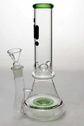 Height : 10" Thick round bowl for 14 mm female joint Thickness : 4.4 mm Base : 4" Honeycomb flat diffuser 3 pinched ice catcher Stemless